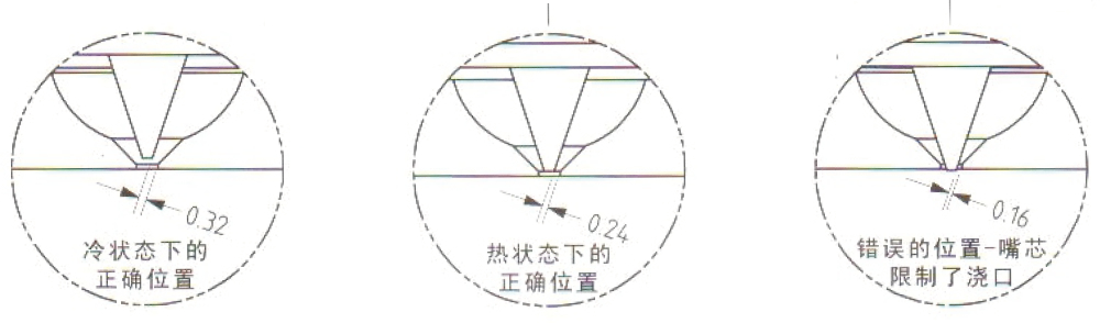3、浇口太小或者因为嘴芯在热嘴内的位置太靠前而使浇口受限制(见附图);